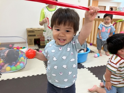 保育者が上からボールのシャワーをかけてあげると大喜びのすもも組さんです(*^_^*)