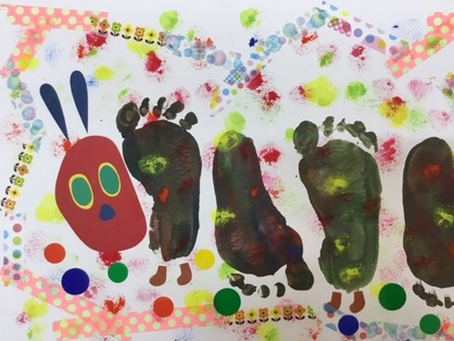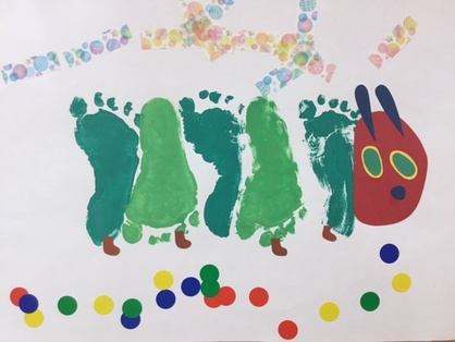 壁に貼ってある、はらぺこあおむしの絵本や在園児の作品を参考に、あおむしを足形で、太陽を手形で作ったり、周りはシール・マスキングテープやタンポ筆を使って飾り付けをしましたよ!