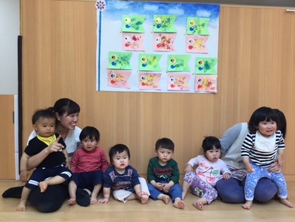 4月27日にはこどもの日の集いを行いました。初めて見るものに興味を持ち身を乗り出す子、保育士の後ろから様子を見る子、様々な反応の子どもたちでしたが最後までペープサートを見ていました。ペープサートを見た後は、みんなで作ったこいのぼりと一緒に写真を撮りました♪子どもたちが作ったこいのぼりは、タンポでうろこを表現しましたよ!初めて見る絵の具に興味津々でした!!