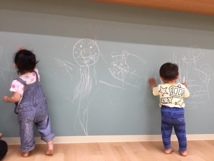 黒板ウォール ホームブログ 部屋の奥の壁が一面黒板のようになっているところがあり、チョークを使って絵を描くことが出来ます!! 子どもたちも初めての時は、え!?描いていいの!?という表情になっていました(笑) 保育者が描き始めると、子どもたちも嬉しそうに壁の端から端まで自由に描いていましたよ♪