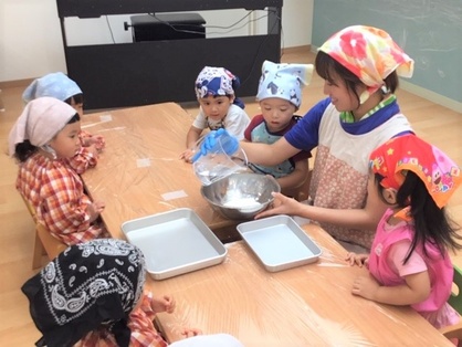 保育者が粉に水を入れると興味津々の子ども達、「やってみたい!」と張り切っていました♪