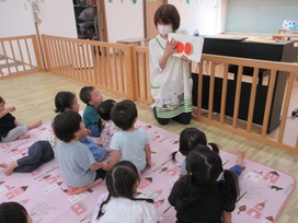 大きなスイカにみんな大興奮(*^▽^*)二歳児さんはバッドを持って勢いよくポコポコポコ!