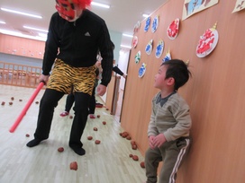 いざ、集いが始まり鬼がやってくると、、、大号泣の子ども達(;_;)でも、勇気を振り絞ったいちご組(2歳児)のお友達が小さいお友達の前に立ち、鬼から守ってくれました!!その隙に、いちご組さんが続々と鬼に豆を投げ、見事撃退する事が出来ました(*^^*)