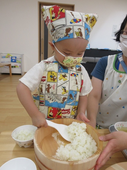 いちご組さんは今月からお当番活動が本格化!おひつのご飯を自分達でよそったり、お味噌汁をお椀によそっています(*^▽^*)