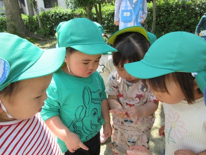 過ごしやすい気候の日が増え、天気の良い日には戸外遊びを楽しんでいます♪最近は様々な生き物に興味津々のいちご組さん!どの公園に行っても虫探しが始まります!(^^)!ダンゴムシやアリ、雨上がりにはナメクジなど虫を探して地面とにらめっこ!子どもたちが大好きな”だんごむしのころちゃん”という紙芝居からダンゴムシの名前はみんなコロちゃんに☆「コロちゃんいたよ!」一人が見つけるとみんなが集まってきて観察会が始まります!手の平に乗せてみたり指でつんつんしてみたり、保育者の後ろからそーーっとのぞき込んだり…虫が苦手だった子どもたちもお友達が楽しそうに観察する姿を見て触れるようになりました(*^-^*)