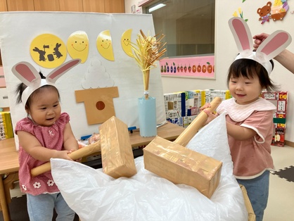 子どもたちは可愛いウサギに大変身☆「ぺったんぺったん!」とお餅つきをしてお月見団子を作りました♪ウサギの耳をつけてお餅をつくお友達を見て「つぎは○○!」と自分の順番が来るのを、今か今かと待っていた子どもたちです(*^-^*)