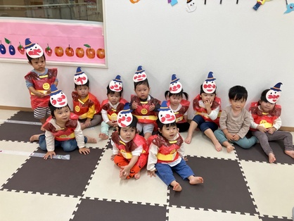 10月31日にはみんなで仮装をし、ハロウィンを楽しみました♡すもも組さんはみんなが大好きなアンパンマンの衣装を着ました✨始めは着ることを嫌がるお友だちもいましたが、みんなが着ている姿を見て、少しずつ『着てみようかな、、、』という気持ちに♡みんなで着ることが出来ました(*^_^*)いちご組さんは自分のマークの果物になりました✨腰回りのタポタポ感がなんとも言えない可愛さです⭐︎去年嫌がっていたお友だちも今回は最後まで着ていることができました⭐︎