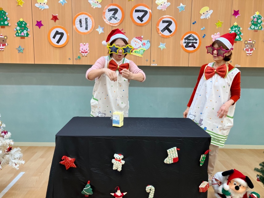 12月25日にはクリスマス会が行われました♪「サンタさんくるかな?」と朝からワクワクの様子の子どもたちです(^ω^)保育者からのマジックショーで盛り上がりました✨