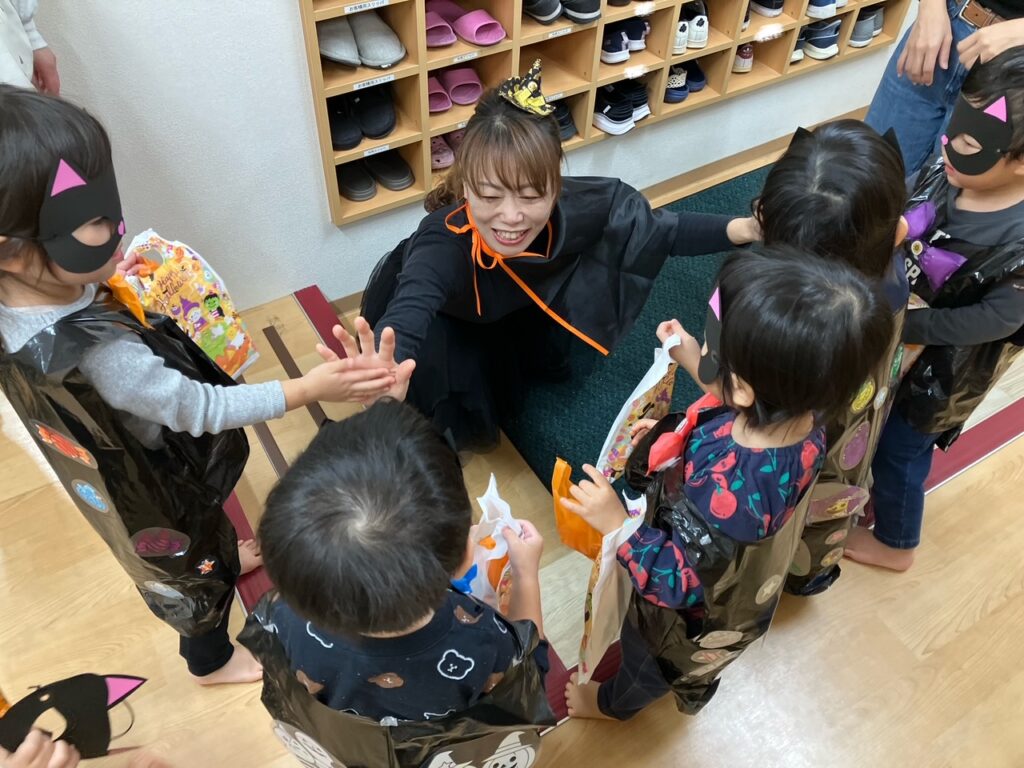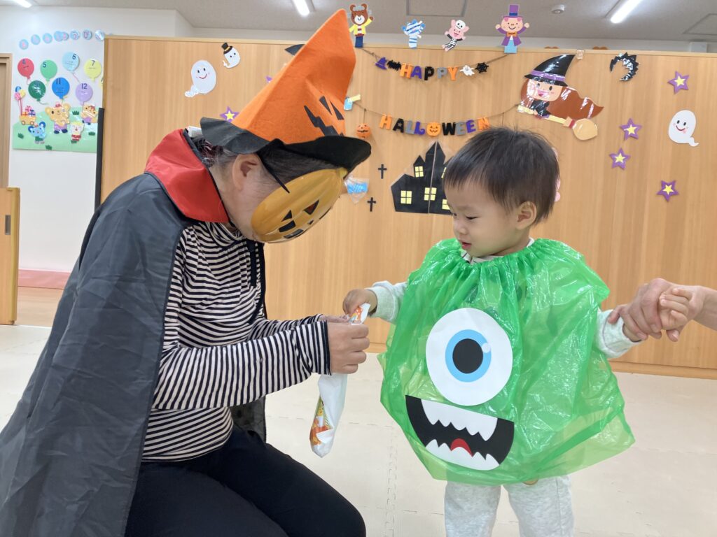 「トリックオアトリート!!!」とみんなで大きな声で掛け声をし、待ちに待ったお菓子をもらいました♡来年のハロウィンも子どもたちがどんな姿を見せてくれるか楽しみです(*^-^*)