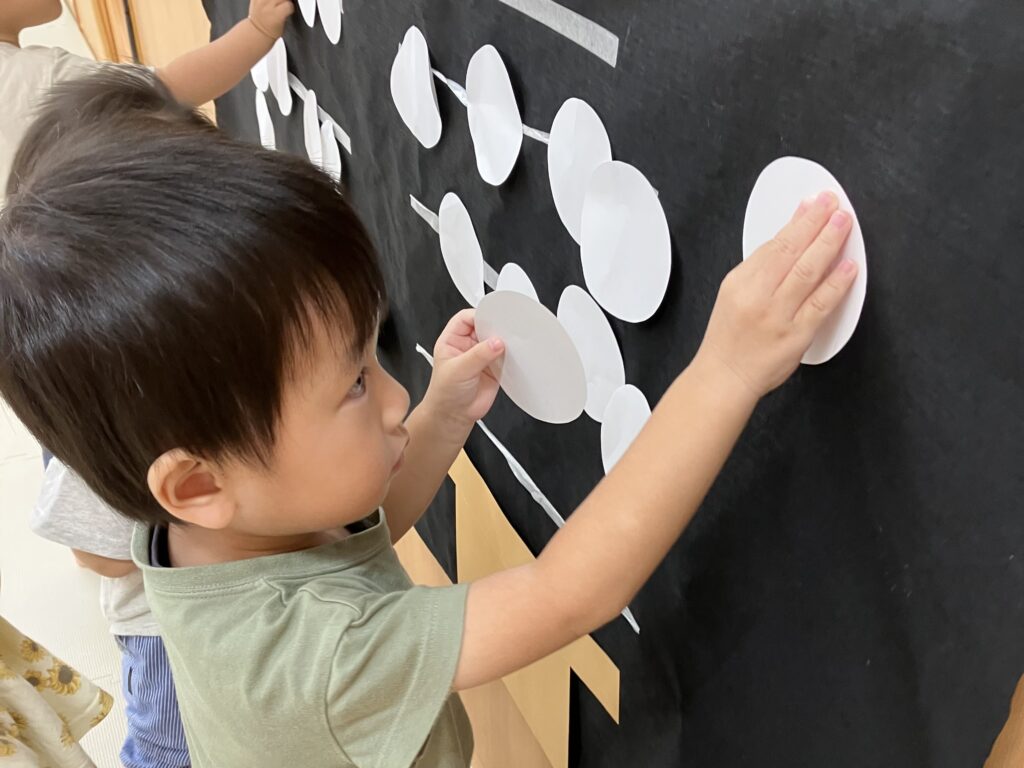 お餅つきが終わってからはお団子の飾り付けをしました🎑小さなお友だちも自分で持ってぺたっ!それを見て負けじと、たくさん貼ってくれました👏あっという間にお供えのお団子が完成!!最後は出来上がったお団子をバックにお写真タイム🎶楽しいお月見会でした♡
