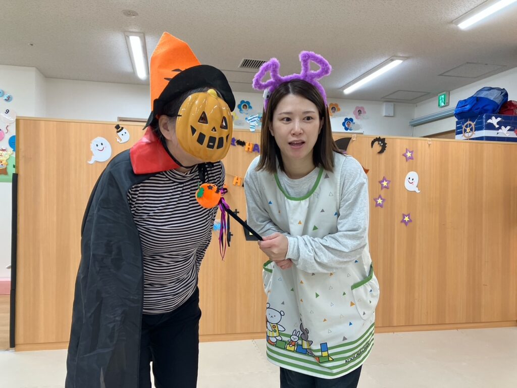 保育園に戻ってくると今度は違うパンプキンマンが登場☆腰を曲げていた様子を見て、「おばあちゃんパンプキンマンだね🤭」とお話しする子どもたちでした(*^-^*)楽しそうな声につられて、近くのカフェのお姉さん、パン屋のお姉さんも可愛い魔女になって駆け付けてくれました♡