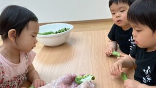 ☆5月のこどもたち☆ そらまめむきをしたよ♪いちご組さんに給食に使うそらまめの殻むきを手伝ってもらいました!数日前から「そらまめくんのべっと」のお話を見ていたので、「そらまめくんいるかなー?」と興味津々の様子でした☆実際にそらまめを目の前にして「大きいねぇ~」と... 2024.06.03