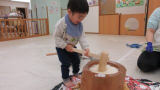 1月のスマイルっこ☆ お餅つき大会をしたよ☆子ども用の小さい臼と杵を使って、お餅つき大会をしました!(^^)!本物のお餅をつく機会も減ってきているなかで、貴重な経験ができた子ども達!!先生たちが「こうやってするんだよ。」とついているのを見て、早くやってみたい!!... 2023.02.02