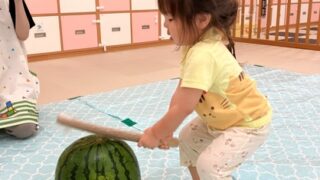 6月のこどもたち スイカ割りをしたよ☆6月に入り、梅雨でじめじめ暑い日が続きました。そんな暑さを吹っ飛ばすため、スイカ割りを行いました!!初めに手作りスイカで割る練習をしました♪棒を持って割れ目に棒を差し込む子どもたち…形を見てどうしたら割れるのかしっかり考... 2023.07.03