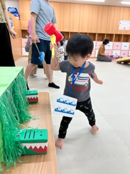 スタンプラリーのカードはICOCAに見立てたSMILEカードです♡手作りのICタッチにピッとして入場です(*^o^*)ボール当てや懐かしのわにわにパニックが大人気でした!!!