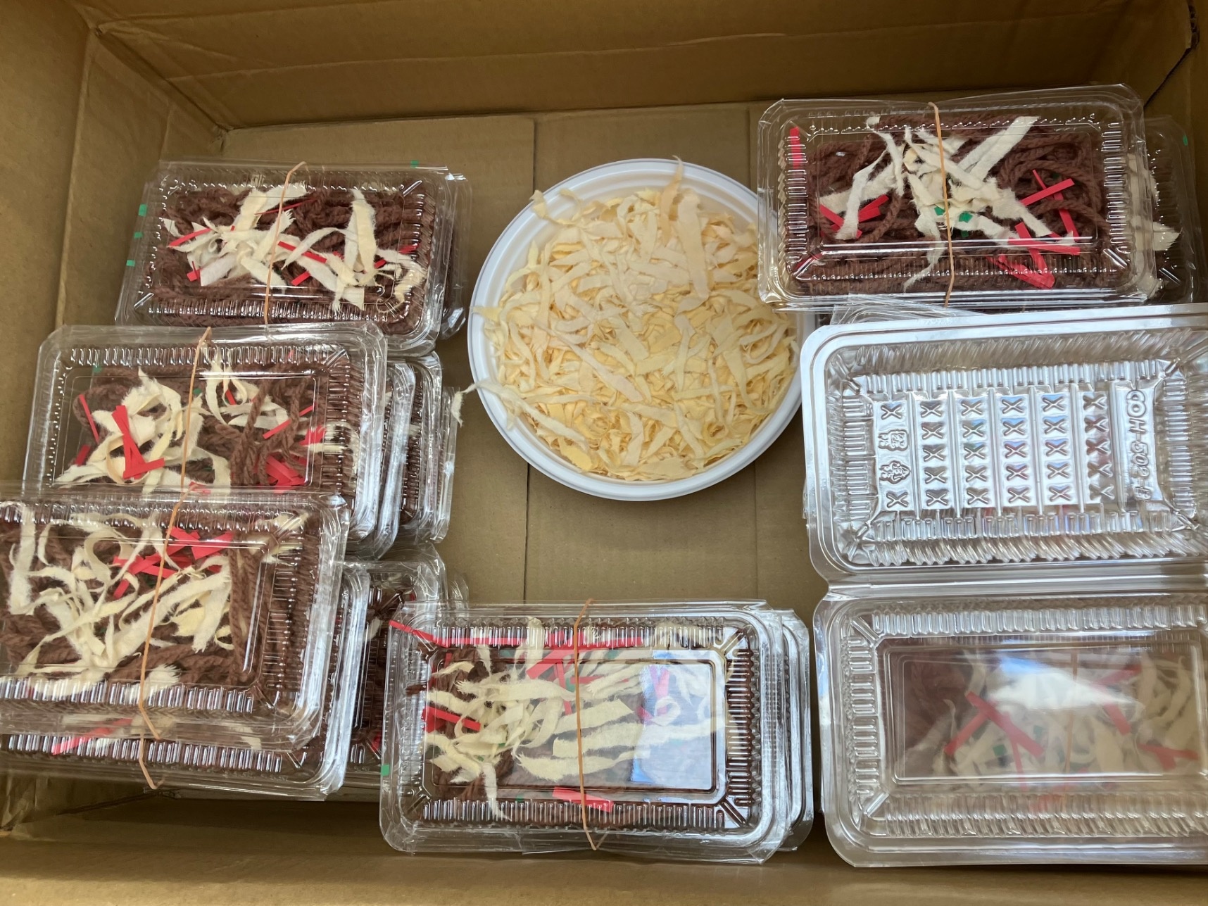 一人ずつかき氷機のハンドルを力いっぱい回してかき氷を作った後は、リンゴジュースを煮詰めて作った手作りシロップをかけてりんご味のかき氷の完成です(*^_^*)